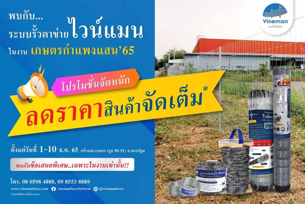 ห้ามพลาด! โปรโมชั่นพิเศษระบบรั้วตาข่ายไวน์แมน ยกขบวนขนสินค้าไปลดราคาสินค้าจัดหนักจัดเต็ม ณ มหาวิทยาลัยเกษตรศาสตร์ วิทยาเขตกำแพงแสน จ.นครปฐม บูธตั้งอยู่ที่หน้าคณะเกษตร ( บูธที่ 90 -91 ) ระหว่างวันที่ 1-10 ธันวาคม 2565 พบกับสินค้ารั้วตาข่ายและลวดหนามซิงค์อลูไวน์แมน ที่ยกขบวนไปลดราคากันทั้งร้าน และมีราคาพิเศษ เมื่อลูกค้ารับเอง เฉพาะในงาน โปรโมชั่นลดราคาจัดหนักสินค้าจัดเต็มแบบนี้พลาดไม่ได้